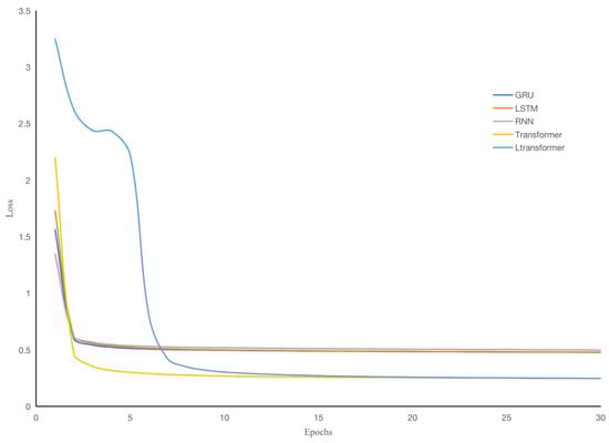 Figure 6 records the average loss per round for each model during training. After extensive experimental validation, we found that after 30 rounds of training, the loss rates of all models did not change significantly anymore. Therefore, we chose 30 rounds as the number of training rounds for all models. This suggests that the LTransformer has a slower rate of loss reduction, which is attributed to the incorporation of multiple dimensions in the LTransformer, which was required to fit different features across these dimensions. Simultaneously, the LTransformer was trained to fit multidimensional features, and its final fitting performance (at the 30th epoch) was better than that of other baseline models.
