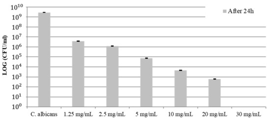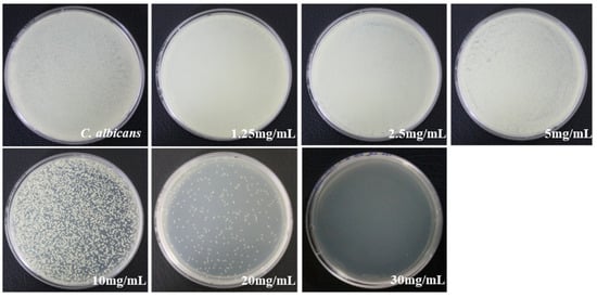 Antifungal activity against C. albicans by COE was observed with no bacterial growth at 30 mg/mL (Figure 2). Table 2 shows the results of the statistical analysis of changes in CFU. As the concentration of COE increased, a clear inhibitory effect on C. albicans was observed. However, there was no statistically significant difference in the concentration of COE from 2.5 mg/mL to 30 mg/mL (p > 0.05).