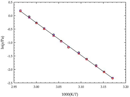 The standard molar enthalpy of sublimation at T = 298.15 K was derived from the sublimation enthalpy calculated at the mean temperature of the experiments, using Equation (6), where is the difference between the molar heat capacities at constant pressure, between the gas and crystal phases. The value of (298.15 K) was calculated using Equation (7) developed by Monte et al. [29], which is a rearrangement of an equation proposed by Chickos et al. [30].