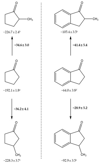 Enthalpic increments (all values in kJ·mol−1) for the insertion of methyl group in cyclopentanone and 1-indanone. a Cyclopentanone [33]. b 2-methylcyclopentanone, value estimated at G3(MP2)//B3LYP level (Table S13). c 3-methylcyclopentanone [9]. d 1-indanone [11]. e This work.