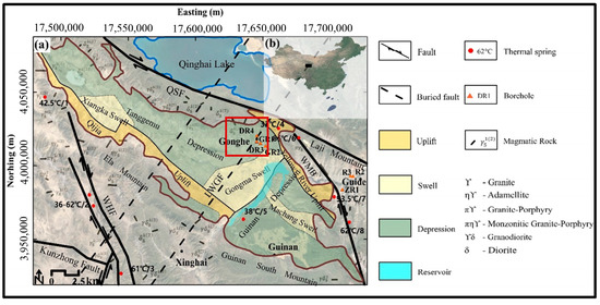 - Zhang, S.; Yan, W.; Li, D.; Jia, X.; Zhang, S.; Li, S.; Fu, L.; Wu, H.; Zeng, Z.; Li, Z.; et al. Characteristics of geothermal geology of the qiabuqia hdr in gonghe basin, qinghai province. Geol. China 2018, 45, 1087–1102. [Google Scholar]