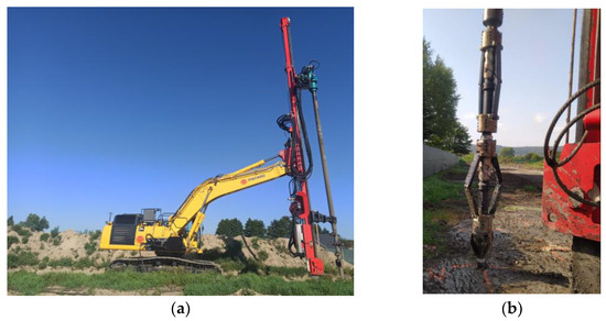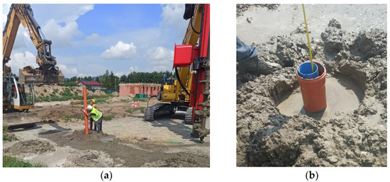 The research program aims to build and test an innovative device for making soil–cement columns. Modifications (calibration) of the method of making the columns are also aimed at the selection of appropriate operational parameters, such as the selection of the density of the injected cement slurry, the applied injection pressure, and the process of feeding the hydraulic binder to the substrate, considering the mixing efficiency. Another important element of the implementation of the test columns was the selection of a hydraulic binder that met the criteria of sustainable development to the maximum extent while guaranteeing the target material parameters of the composite obtained. Through preliminary analyses, it was decided to choose the cement of multi-component Portland cement CEM II B-V with the addition of by-products from coal combustion in the power industry. The choice was determined by the fact that silica fly ashes, which are in fact processed post-production waste, are a significant addition to this cement. As part of recycling, they are reused in the technological process of manufacturing the cement.