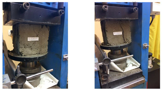 Testing of soil–cement composites requires some corrections and modifications in relation to the prepared standard procedures that are commonly used for testing concrete. Due to the much lower strength (especially when cohesive and/or organic soil is considered) and achieving maximum strength with much greater deformations, higher compression rates can be used. To a greater extent, the determined modulus of deformation is also influenced by the “laying error”, i.e., the so-called “bedding error”, which can be eliminated by precompressing the sample with a predetermined stress range. However, such a procedure is troublesome when it is not known what strength to expect. It seems very reasonable to determine the strain modulus as the slope of the strain–load relationship in the range around half the strength of the sample. In the tests conducted in the AGH laboratories, a range of 0.30–0.70 Rc was used (where Rc is just the compressive stress capacity of the sample), similar to the ranges used in earlier research projects by MENARD carried out in cooperation with the Wroclaw University of Technology. Exemplary pictures of samples in a testing machine (WrUST laboratory) are shown in Figure 6 [36].