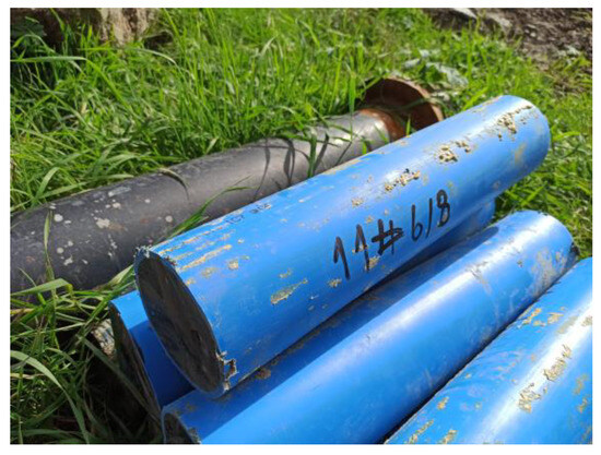 Initial considerations aimed at maximizing the objectivity of the obtained results indicated the need to collect cylindrical samples of appropriate slenderness (H/D = 2) obtained from the entire profile of the column using the “pipe in pipe” method, i.e., by embedding a PVC pipe in the fresh material of the column (after cycles of injection and mixing but before the soil–cement composite hardens). An example of such a continuous core in a PVC pipe is shown in Figure 4.