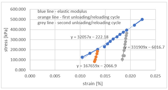 Maintained load test in laboratory conditions makes it possible to control several unloading/reloading cycles. Elastic modulus may be derived from the stress–strain curve. In the test, two procedures were applied, depending on the number of unloading/reloading cycles. If the sample was unloaded/reloaded only once, the cycle was scheduled at 50% of expected compressive strength. If the procedure had to be repeated twice, the unloading was scheduled at 33% and 66% of the estimated compressive strength. Such a procedure is presented in Figure 8.