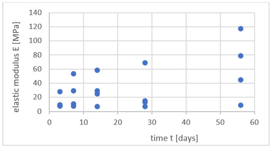 Another problem of major importance is the optimal time for curing. From the figures given below (Figure 10, Figure 11 and Figure 12), we may observe that all the measured values are highly time-dependent. The composite density in Figure 10 decreases slowly in the second month of curing. Changes in compressive strength (Figure 11) and elastic modulus (Figure 12) seem to be far more significant and prove the necessity to prolong the curing times of DSM samples up to two or even three months to gain valuable and reliable information. No trendline was provided in Figure 11 and Figure 12, just so as not to be misleading. One may observe that increasing with time values of Rc and E should still be considered with cautious attention due to the simultaneously increasing standard deviation of the gathered results.