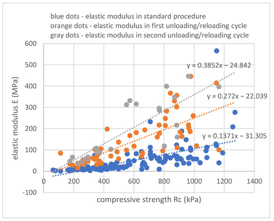 The results presented above are focused on the elastic modulus of soil–cement composites in the first cycle of loading. Some samples were unloaded and reloaded once or twice. A significant increase in stiffness may be observed in the subsequent stages of unloading/reloading. The graph given below presents the results in the composite strength domain and in the composite density domain. As it was presented above, a higher density (better compaction of the composite) is positively correlated with composite compressive strength and, consequently, with the stiffness measured by means of elastic modulus.