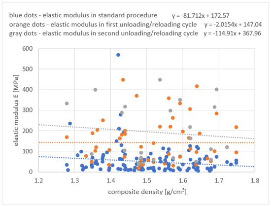 Elastic modulus E vs. composite density. Values derived from stress–strain curves in subsequent stages of unloading/reloading cycles.