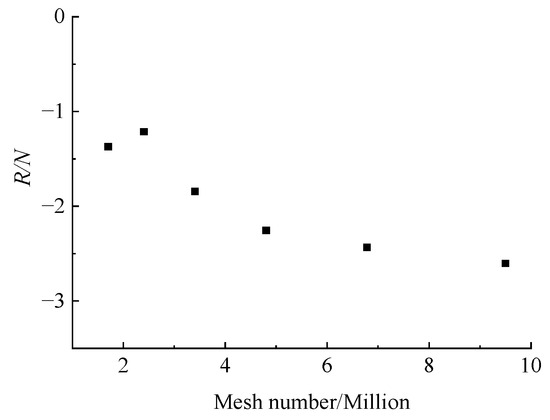 In STAR-CCM+, the trimmed cell mesher is used for generating grids, with the focus on refining the grid in the region of turbulent flow around the leeward side of the dune. The wall treatment uses a full method, with the AUV’s surface utilizing a prism layer of five layers and an expansion ratio of 1.1. By setting the thickness of the prism layer, the non-dimensional wall distance is achieved to meet computational requirements. During grid independence evaluation, extreme conditions are considered by placing the AUV very close to the leeward side of the dune. The average resistance acting on the AUV is used as a validation parameter for grid independence evaluation. The results of grid independence evaluation are illustrated in Figure 3. From Figure 3, it can be seen that as the number of grid cells in the computational domain increases, the average resistance acting on the AUV gradually converges. The average resistance values for grid cell numbers of 6.78 million and 9.5 million are already very close. However, performing calculations with a higher number of grid cells would entail significantly higher time costs. Therefore, balancing computational accuracy and efficiency, a grid density corresponding to 6.78 million grid cells is selected for the calculations. In the final simulations, the AUV’s position within the turbulent flow field is considered, with its bow located at a distance of 3.5 m from the inlet. As shown in Figure 4, the number of grids used in the final calculation is about 7 million. The calculations are performed using a 20-core computer, it takes about 48 h to calculate one case.