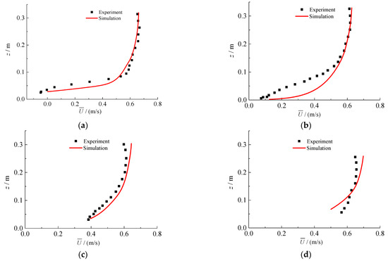 The accuracy of the numerical method was verified using the test data of Van Mierlo et al. [24]. Specifically, the experimental data from their T6 test case were selected for comparison. In that experiment, an artificial dune with a length of approximately 1.6 m and a height of about 0.08 m was used. The shape of the dune was the same as that described in Section 2.3 and shown in Figure 5. The flow was in the positive direction of the x-axis. The experiment provided information about the flow field along vertical lines at different downstream distances from the crest of the dune. In this paper, the longitudinal average velocity distributions along vertical lines located at distances of 0.13 m, 0.48 m, 0.82 m, and 1.27 m downstream from the dune crest were selected for verification, as illustrated in Figure 5. Based on the experimental data, a dune model with the same scale as the experiment was established for numerical simulation. To closely match the experimental conditions while ensuring computational efficiency, the length of the calculation domain was set to 1.6 m, the height to 0.37 m, and the width to 1 m. The boundary conditions were set the same way as described in Section 2.3, based on the flow velocity information provided in the experiment at the location closest to the inlet. The test was carried out by changing the flow velocity of the velocity inlet in the simulation and finally setting the flow velocity of the velocity inlet in the simulation to 0.68 m/s to match the experiment.