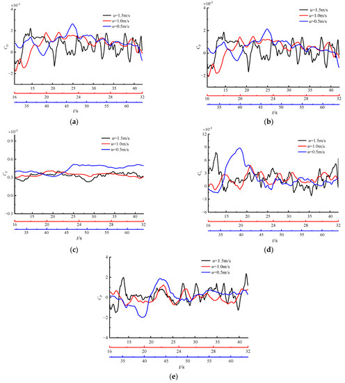 Instantaneous variation in the hydrodynamic coefficients of the AUV at different incoming flow velocities; : (a) total resistance coefficient; (b) pressure resistance coefficient; (c) friction resistance coefficient; (d) lift coefficient; and (e) pitch moment coefficient.
