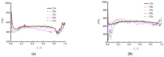 Pressure distribution on the upper and lower sides of the AUV’s longitudinal section in the center plane at different times; and : (a) upper side and (b) lower side.