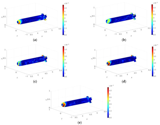 Skin friction coefficient distribution on the AUV’s surface at different times; and : (a) 15 s; (b) 20 s; (c) 25 s; (d) 30 s; and (e) 35 s.