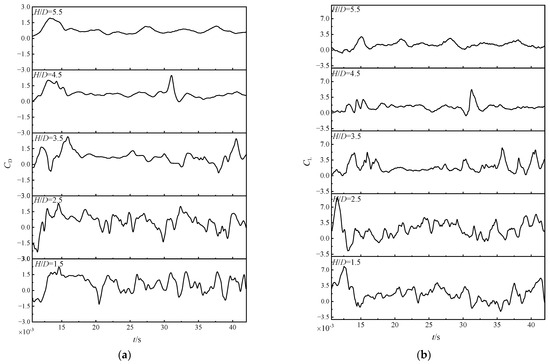 When , a Fourier analysis was performed on the time-domain curves of the AUV’s total drag coefficient, lift coefficient, and pitch moment coefficient under different near-seafloor distances. Based on the results of the Fourier analysis, the original time-domain curves were filtered to obtain the time-domain curves of the hydrodynamic coefficients corresponding to the main frequency components.