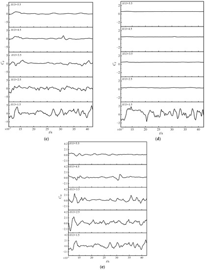 Instantaneous variation in the hydrodynamic coefficients of the AUV at different distances from the seafloor; : (a) total resistance coefficient; (b) pressure resistance coefficient; (c) friction resistance coefficient; (d) lift coefficient; and (e) pitch moment coefficient.