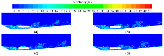 Figure 17 shows the distribution of the average skin friction coefficients of the AUV for at different near-seafloor distances. It is evident that with increasing near-seafloor distance, the average skin friction coefficient on the AUV surface gradually increases. Figure 18 presents velocity distribution contours around the AUV. Influenced by the terrain, the leeward side of the dune presents lower flow velocities. As it moves farther away from the seafloor, the flow velocities increase, and consequently, the shear stress on the AUV surface increases, leading to an increase in friction resistance. However, it is observable that the average skin friction coefficient in the stern region of the AUV decreases with increasing near-seafloor distance. Figure 19 shows the vortex structures in the flow field near the AUV at the final moment for and , with Q = 30. In regions with higher flow velocities far from the seafloor, the shedding of stern vortices of the AUV becomes more obvious, leading to easier flow separation in the region near the stern, which results in a reduction in shear stress on the stern surface.