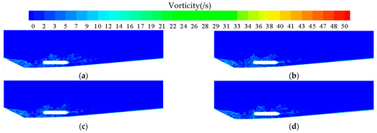 Vorticity distribution contours at different times; and : (a) 40 s; (b) 41 s; (c) 42 s; and (d) 43 s.
