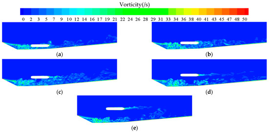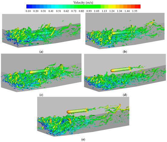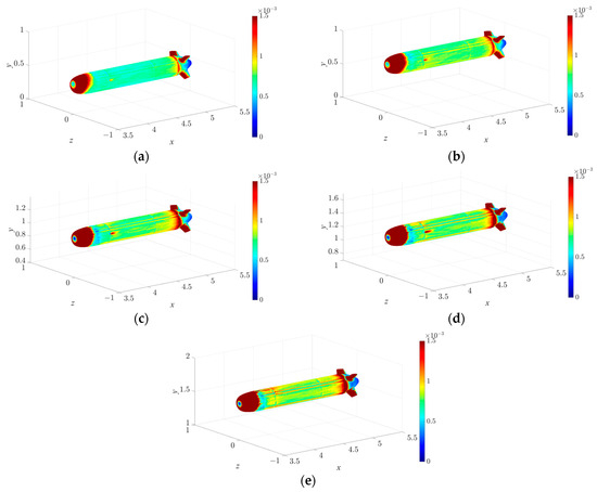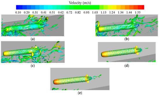 Vortex structure distribution near the AUV in the final time step (); : (a) ; (b) ; (c) ; (d) ; and (e) .