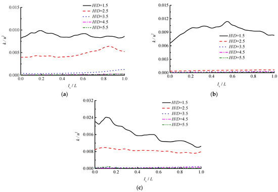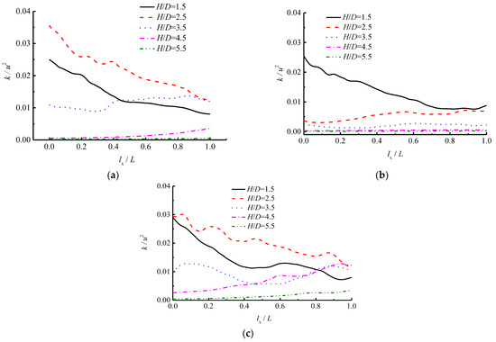 Dimensionless turbulent kinetic energy at 0.05 m from the upper surface of the AUV in the longitudinal section of the AUV in center plane: (a) ; (b) ; and (c) .