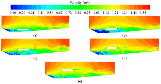 Velocity distribution contours around the AUV at different near-seafloor distances; : (a) ; (b) ; (c) ; (d) ; and (e) .