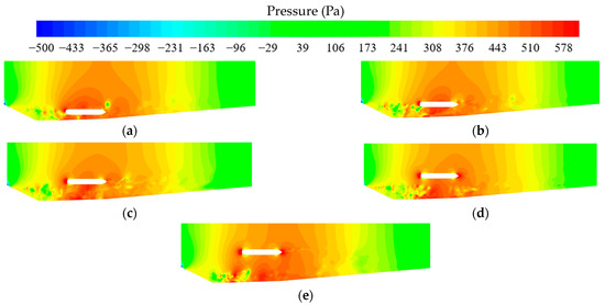 Pressure distribution contours around the AUV at different near-seafloor distances; : (a) ; (b) ; (c) ; (d) ; and (e) .