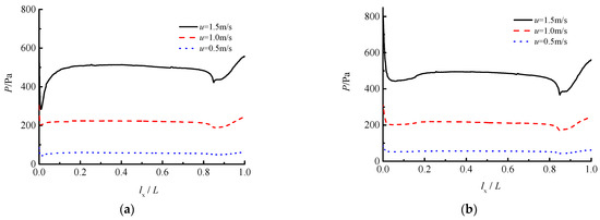 Average pressure distribution on the upper and lower sides in the longitudinal section of the AUV in the center plane at different incoming flow velocities; : (a) upper side and (b) lower side.