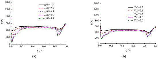 Average pressure distribution on the upper and lower sides in the longitudinal section of the AUV in the center plane at different near-seafloor distances; : (a) upper side and (b) lower side.