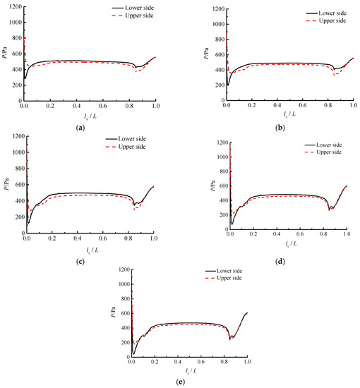 Comparison between the average pressures on the upper and lower sides in the longitudinal section of the AUV in the center plane at different near-seafloor distances; : (a) ; (b) ; (c) ; (d) ; and (e) .