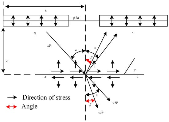 where σ(i) and τ(i) represent the normal and shear stresses along the joint interface, respectively; zp and zs are wave impedances of P and S waves, respectively, which are 15,449,500 and 6,307,800; vIP and vTs are particle vibration velocities of the incident P wave and transmitted S wave, respectively; and α is the incident angle, reflection angle, and transmission angle of the P wave. β is the reflection angle of the reflected S-wave and the transmission angle of transmitted S-wave. σd is stress at the end of the joint under in situ stress, and τd is the shear stress at the end of the joint under in situ stress. In this study, σ1 and τ1 are approximately equivalent to the in situ stress values at the midpoint of the joint.
