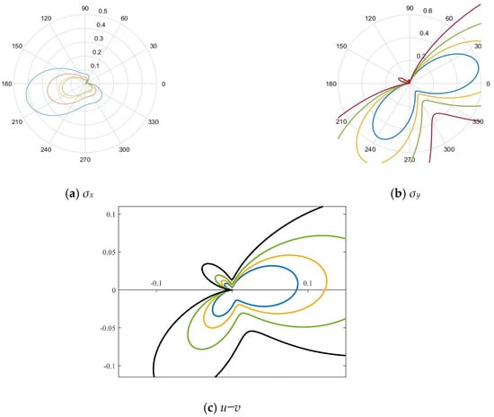 It can be seen from Figure 3a that at the joint end, σx is positive in the direction of 0°–330° and subjected to tensile stress, whereas it is negative in the direction between 330° and 360° under compressive stress. σx is not symmetrical along the joint interface, and σx stress gradient increases rapidly in the direction of 300°–330°, forming a stress concentration area. Figure 3b shows that at the joint end, σy is positive in the direction of 0°–180° under tensile stress. On the other hand, it is negative in the direction of 180°–360° and subjected to compressive stress. Although stress is symmetrically distributed along the joint interface, it can be clearly found from the figure that the σy stress field is not distributed symmetrically. Comparing Figure 3a,b, however, there are normal stress components in σx, and σy and σx had a larger stress range. It can be seen from Figure 3c that the lateral displacement of the joint end is affected by the stress components in both directions. Although an intuitive understanding of the stress field distribution at the joint end can be obtained from the stress contour diagram, the asymmetry and continuous changes in the whole process still cannot be analyzed from the contour plot. Thus, the numerical simulation method is used to analyze the stress change in the wave acting on the mass point on the left side of the joint. Based on the following three figures, the stress field of the joint particle is asymmetric.