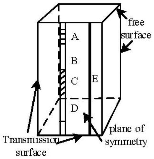 Blasting model of micro-delayed holes. A—Stemming 7 m, B—Explosive 6 m, C—Interval 5 m, D—Explosive 8 m, E—Joint.