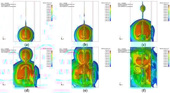 Contours of effective stress. (a) t = 1197 μs, (b) t = 1498 μs, (c) t = 2298 μs, (d) t = 2999 μs, (e) t = 3598 μs, (f) t = 4798 μs.