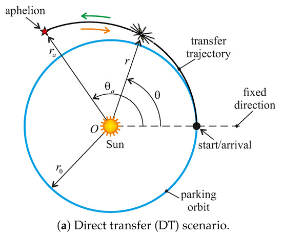 More precisely, in a DT the radial distance increases continuously with time until the spacecraft reaches the aphelion point (subscript a), as shown in Figure 2a. Instead, a trajectory with a (single) SWA contains an initial phase where the spacecraft approaches the Sun to increase its propulsive acceleration magnitude, and then rapidly grows its radial distance to reach the aphelion point [37]; see the scheme of Figure 2b. Note that the mathematical model discussed in the previous section does not include a constraint on the minimum solar distance, that is, a constraint on the perihelion (subscript p) distance, as was considered in the model described in Ref. [37]. Therefore, the (unconstrained) perihelion distance is an output of the optimization process in a transfer with a single SWA.