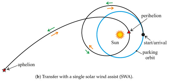 The numerical simulations show that a generic COFT can ideally be divided into two symmetrical parts: (i) a first half part of the transfer trajectory in which the spacecraft reaches, at time , the aphelion point with a zero inertial velocity, that is, with (see the green arrows in Figure 2); (ii) a second half-part in which the spacecraft retraces the trajectory obtained in the first half part backwards until it again reaches the starting point with and (see the orange arrows in Figure 2). In particular, a COFT with a DT has a lenticular shape, while a COFT with a single SWA is characterized by a knot shape that encompasses the Sun. A conceptual sketch of these two possible shapes of a COFT is shown in Figure 2.