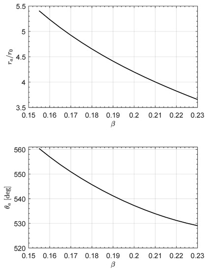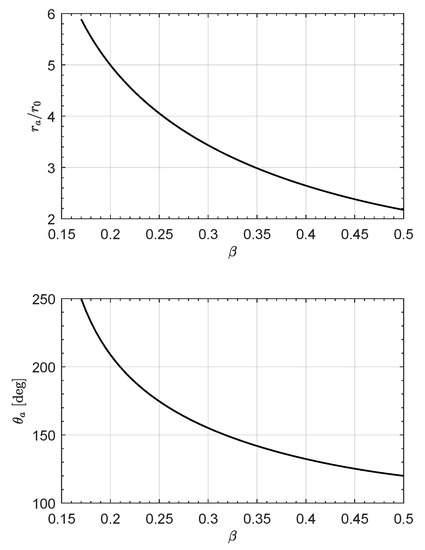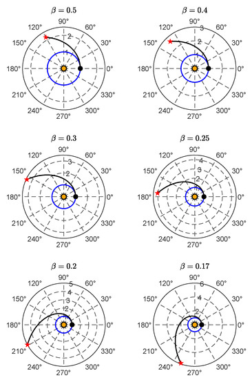 The presence of a SWA obviously complicates the shape of the transfer trajectory, as confirmed by the schemes in Figure 2 and, more importantly, introduces a perihelion point at a solar distance less than the radius of the circular parking orbit; see Figure 7. Note, however, that Figure 7 does not give the actual value of , but it only reports the ratio as a function of the E-sail propulsive characteristics, so that the actual distance of from the Sun depends on the value of . This is an important consideration, because in an E-sail mission scenario the value of is inferiorly limited by the maximum operating temperature of the conducting tethers. For example, an E-sail structure made of aluminum tethers must operate at a solar distance greater than , while using copper tethers in the sail design reduces the minimum solar distance to about [42]. In the latter case, if the parking orbit radius is , Figure 7 shows that SWA transfers with are unfeasible. If, instead, , Figure 7 states that should be less than about .