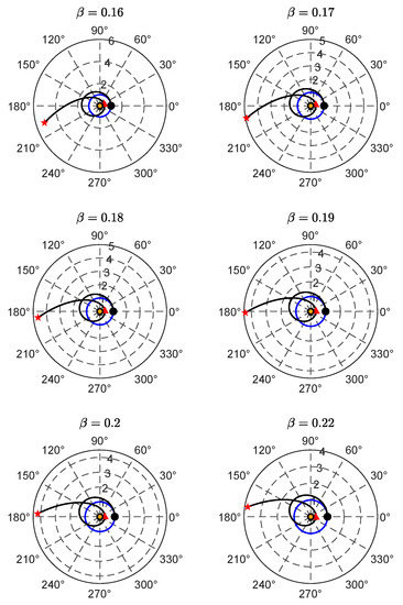 For example, assuming again , an optimal COFT obtained with has an aphelion point at a distance of about from the Sun, and the E-sail sweeps a polar angle of about to move from the starting to the aphelion point. This same result is clearly visible in the polar COFT depicted in Figure 5, which also shows the optimal transfer trajectories for different values of .