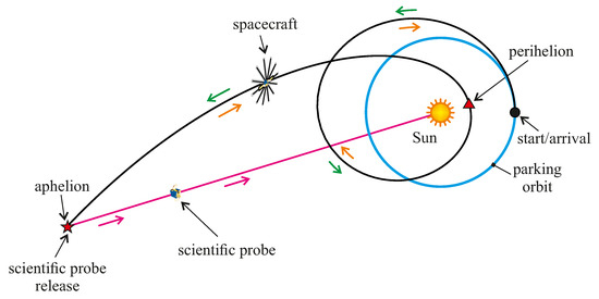 The presence in the optimal COFT of a heliostationary aphelion point with a solar distance on the order of a few multiples of , in both a DT- and SWA-based scenario, suggests a potential (and additional) interesting application of this advanced two-dimensional trajectory concept. In fact, as proposed by the authors a few years ago, a propellantless propulsion system can be used to achieve a linear trajectory (i.e., a Keplerian orbit with a null value of the semilatus rectum) that allows the spacecraft to move along a straight, radial path to regions near the Sun to obtain in situ measurements of the space surrounding our star. Building on that mission concept, in a COFT-based scenario, a “piggy-back” science probe could be released at the aphelion point with a heliocentric velocity equal to zero. Upon release, the main spacecraft (i.e., the vehicle propelled by the E-sail subsystem) would return to the circular parking orbit by retracing the heliocentric path, while the scientific probe would follow the linear trajectory to final destruction in the Sun’s inner regions. This specific mission concept, in the case of a single SWA maneuver, has been schematized in Figure 10, which represents the extended version of the scheme in Figure 2b. In particular, the magenta line in Figure 10 indicates the linear trajectory followed by the science probe after its release (with zero inertial velocity) at the COFT’s aphelion point. Note that the same mission concept can also be applied to a DT case.