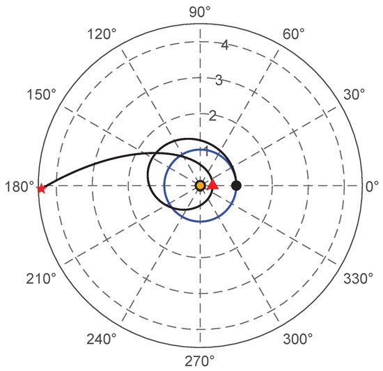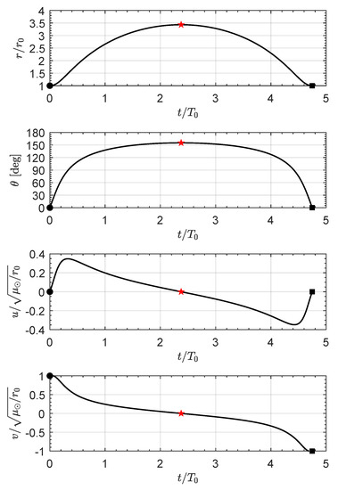 The first mission example refers to a DT obtained with a medium-high performance E-sail with . According to Figure 3, the minimum flight time is , while the aphelion point has a radial distance and its polar angle is ; see also Figure 4. The polar form of the COFT is shown in one of the plots included in Figure 5, while the time variations of the state variables are reported in Figure 11, where the red star indicates the aphelion point reached during the transfer trajectory.