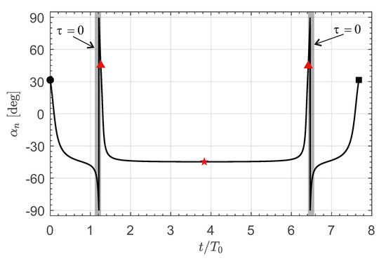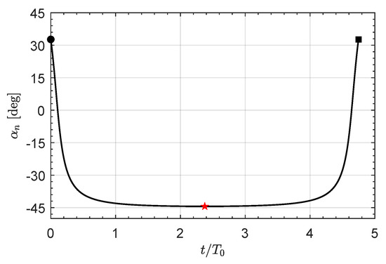 Time variation of the sail pitch angle in a DT scenario with . Black circle → start; red star → aphelion point; black square → arrival.