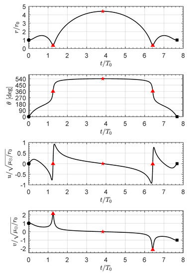 The time variations of the state variables are shown in Figure 14, where the presence of two red triangles indicates that the perihelion point is reached by the spacecraft at two separate instants of time, due to the inherent symmetry of the problem. A comparison between the curves in Figure 14 and those sketched in Figure 11 clearly shows that the general trends of the state variables in a DT and SWA case are profoundly different, even in the presence of a heliostationary condition at the aphelion point. Indeed, note how the two components of the spacecraft velocity are both zero at the midpoint of the COFT.