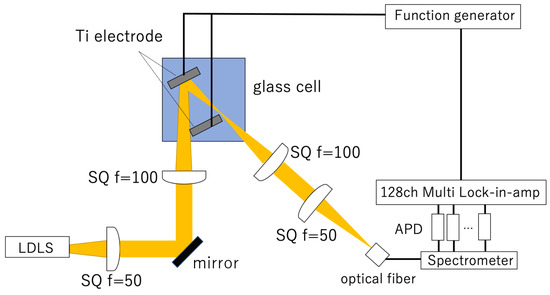 White probe light from an LDLS (Laser-Driven Light Source EQ-99 X, wavelength range of 170 to 2100 nm, Energetiq Technology, Wilmington, MA, USA) was collimated and focused on the sample (the surface of the voltage-applied electrode facing the ground electrode) with unpolarized light and 25° angle of incidence. The optics were arranged so that the probe light intensity was as low as possible: The probe light was irradiated onto the electrode at a position out of focus, so that the diameter of the light spot size was about 8 mm, compared to the 10 mm width of the electrode. The white light intensity was approximately 5.6 mW/cm2. The reflected light was collimated and focused onto an optical fiber bundle and led to a spectrometer (Acton SpectraPro-300i, Acton Research Co, Acton, MA, USA) for spectral analysis. Light for each wavelength was sent through a bundled fiber array to the APD + preamplifier for conversion into an electrical signal, and the component whose intensity changed synchronized with was detected with a multi(128)-channel lock-in amplifier (7210, Signal Recovery, Edinburgh, UK) [11,20].
