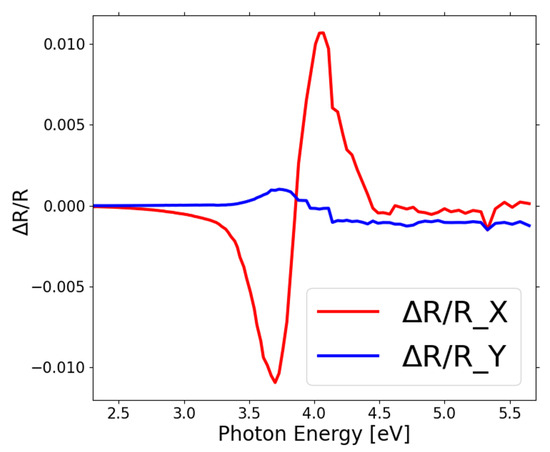 To obtain high transmittance of the UV component of the probe light, synthetic quartz (90% transmittance up to 200 nm) is used for the lens. Although chromatic aberration causes differences in light collection efficiency at the fiber incidence plane, the optics were adjusted so that the blue-UV component of the detected white light spectrum is enriched in order to measure signals in the UV region with the best possible S/N ratio. Since the signal is normalized to (the reflected light intensity change )/(reflected light intensity ), the magnitude and shape of are not affected by chromatic aberration. The diffraction grating in the spectrometer was 150 lines/mm, and the blaze wavelength of 300 nm. The wavelength (photon energy) resolution was 3.2 nm (0.030 eV) at 365 nm (3.396 eV).