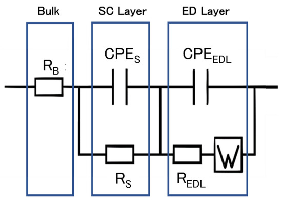 The equivalent circuit was estimated so that the fitting curves matched the Nyquist plot and the Bode diagram. The best fit was obtained using the equivalent circuit in Figure 8. In this case, the two electrodes are symmetrical because they are opposing Ti electrode plates with the same surface area. Therefore, the circuit should be valid for each electrode. Figure 7 shows the results of fitting with the equivalent circuit in Figure 8. The values of each circuit element obtained from the fitting are summarized in Table 1.