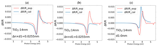 Experimental (dashed line) and calculated (solid line) electroreflectance spectra. (a) Assuming refractive index change in the EDL of water () and complex refractive index change in the TiO2 film (red-shift by 1.5 meV). (b) Assuming only the refractive index change () in the EDL of water. (c) Assuming only complex refractive index change (red-shift by 1.5 meV) in TiO2 film.