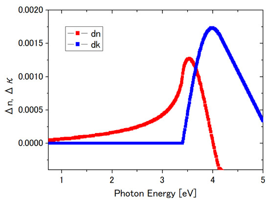 Complex refractive index change due to 1.5 meV red shift of complex refractive index in TiO2 film assumed in the calculation of electroreflectance spectra in Figure 12.