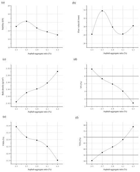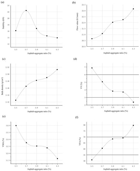 The Marshall test method is commonly used to determine the optimum asphalt binder content of asphalt mixtures. The optimum asphalt binder content can be calculated using the parameters of the Marshall test with different asphalt–aggregate ratios. In this paper, the optimum asphalt binder content was determined by the matching ratio that all the indexes above met the requirements for.