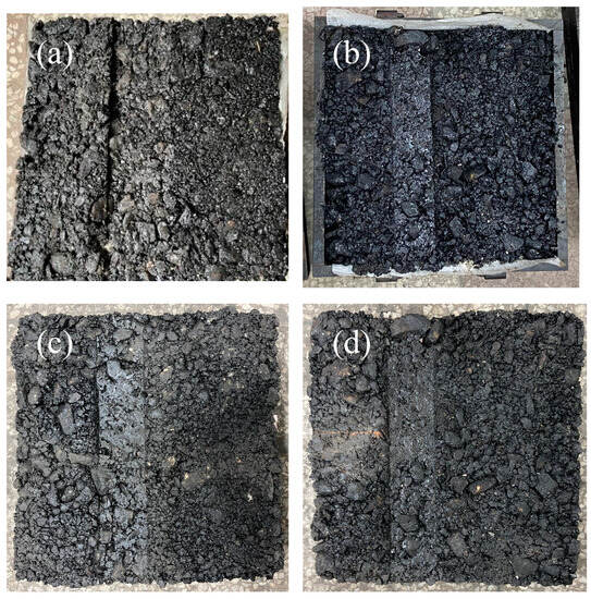 DS of 40%HMA was much larger than that of NHMA. This is because the old asphalt binder in RAP increased the hardness of the recycled asphalt mixture, thus improving the high-temperature performance of 40%HMA. After adding the waste engine oil to 40%HMA, the waste engine oil restored some of the rheological properties of the old asphalt binder. The waste engine oil softened the old asphalt binder and thus reduced the high-temperature stability of 40%RHMA and made it more similar to NHMA. Due to the good mechanical strength of carbon nanotubes, the addition of carbon nanotubes to 40%RHMA increased the high-temperature deformation resistance of the recycled asphalt binder between aggregates. Carbon nanotubes played a “reinforcing” role” between the waste engine oil, recycled asphalt binder and could effectively enhance the high-temperature stability of the waste oil, recycled asphalt mixture. Among them, 40%RHMA-1.5C showed the greatest improvement in high-temperature rutting resistance, which increased by 24.3% compared with 40%RHMA. However, the high-temperature stability of the waste engine oil, recycled asphalt mixture would have been adversely affected if too many carbon nanotubes were added. The rutting plate samples after the high-temperature rutting test are shown in
