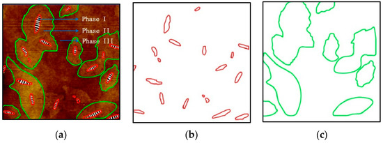 Based on the AFM microscopic images and the mechanical parameters measured via AFM, a two-dimensional FEM was built to analyze the stress and strain distribution law of the asphalt binder microstructure. In Figure 1, the AFM image consists of three parts, the darkest colored bee phase (Phase I), the bee casing (Phase II) that wraps around the bee phase (the bee casing content in the later text includes the bee phase), and the interstitial phase (Phase III) that fills in between the bee casings [35,36]. It is interesting to note that the bee phase can also be seen as the old asphalt binder in the recycled asphalt binder, and the bee casing can be considered as the interfacial phase where the old and new asphalt binders mix. Additionally, the interstitial phase can be viewed as either the new asphalt binder or the rejuvenator. The effect of the old material dosing below the critical dosing level on the micromechanical properties of the recycled asphalt binder is analyzed by simultaneously varying the content of the bee phase and the content of the bee casing.