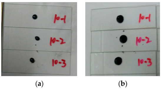 In this study, AFM was chosen to observe and characterize the micromorphology of asphalt binder as well as its surface properties. In the AFM sample preparation, the asphalt binder was first heated to 140 °C, and 20 ± 0.5 g of asphalt binder was weighed and dropped onto the center of the slide, as shown in Figure 2a. Then, the samples were placed in an oven at 100 °C for 30 min (this step was performed to reduce the effect of thermal history on the test results), and the heated samples are shown in Figure 2b. Finally, the samples were stored in a Petri dish with a lid to prevent dust from falling on the surfaces of the samples. We prepared for AFM characterization experiment, which was conducted in Peak Force QNM mode with a peak force set point of 10 nN and a scanning area of 30 × 30 µm2.