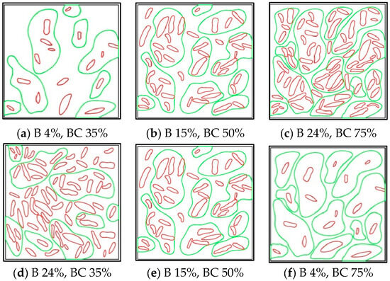 A simultaneous variation in the contents of the bee phase and the bee casing was achieved via finite element simulation to explore the effect of internal microstructural changes on the micromechanical property of an asphalt binder during aging and rejuvenation. It also illustrates the effect of the old material dosage on the micromechanical behavior of a recycled asphalt binder when the old material dosage is below the critical dosage. The doping of the bee phase and bee casing selected for this paper included six groups, three of which were increased in both the bee phase (B) and bee casing (BC) contents, specifically (a) B 4%, BC 35%; (b) B 15%, BC 50%; and (c) B 24%, BC 75%. The other three groups were decreased in the bee content and increased in the bee casing content, specifically (d) B 24%, BC 35%; (e) B 15%, BC 50%; and (f) B 4%, BC 75%. It should be noted that the content of each phase in the honeycomb structure was determined by the area of the image. The constructed finite element model is shown in Figure 4.